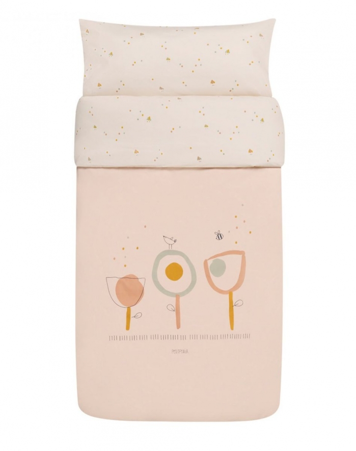 Conjunto composto por capa de edredão, lençol de baixo, fronha de almofada, protector de cama e edredão para cama de 60 x 120 cms.